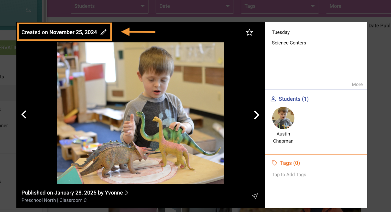The capture date of a Moment/observation determines what assessment period the photo will be applied towards. Please note that the capture date can differ from the published date. The capture date of a Moment is located in the top left corner of a photo and can be edited if needed so that it falls within the applicable period. The period dates for your account can be accessed through your Settings on the Kaymbu platform. For more information on Period Settings, you can click here.