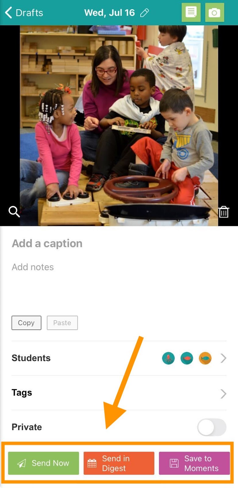 - Save to Moments: saves the photo to the Moments page, but it does not get sent to families.