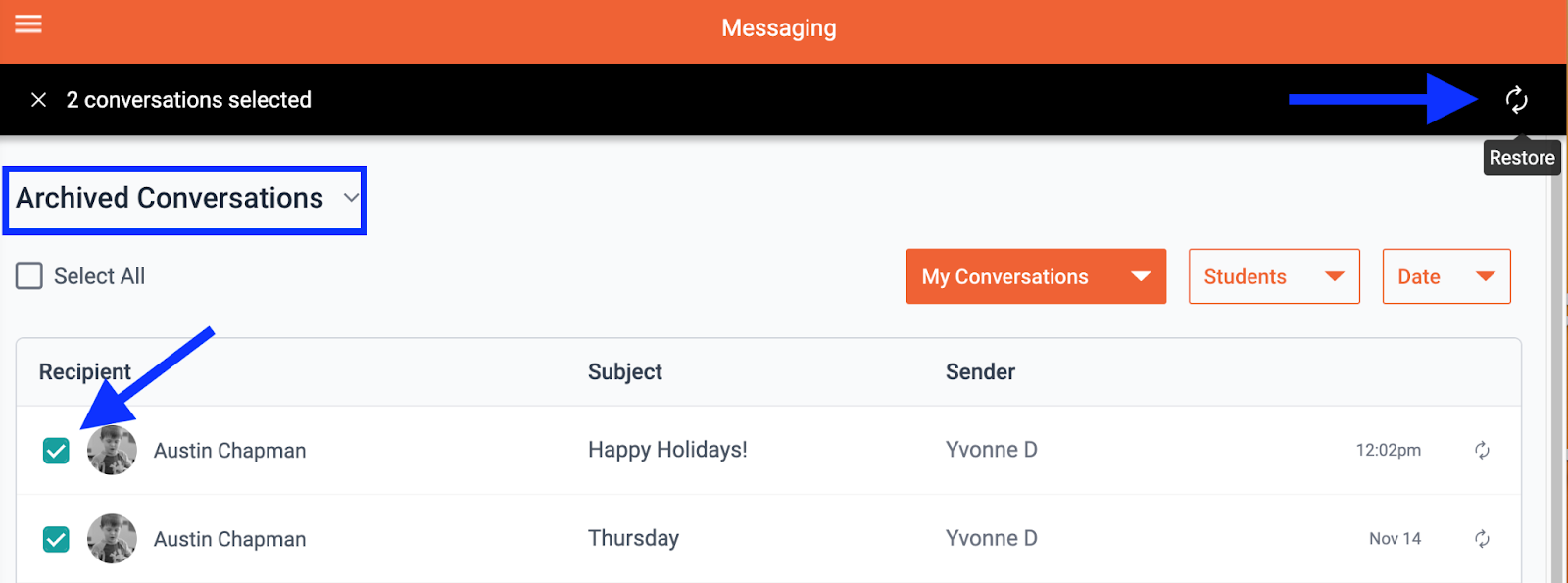 To do so, click on the drop-down arrow next to “Active Conversations” and select “Archived Conversations.” Once you have accessed all your Archived Conversations, open the message or select multiple messages and click the restore icon that appears at the top of the page. This will restore the message to an Active Conversation, and the message will be moved to your active inbox.
