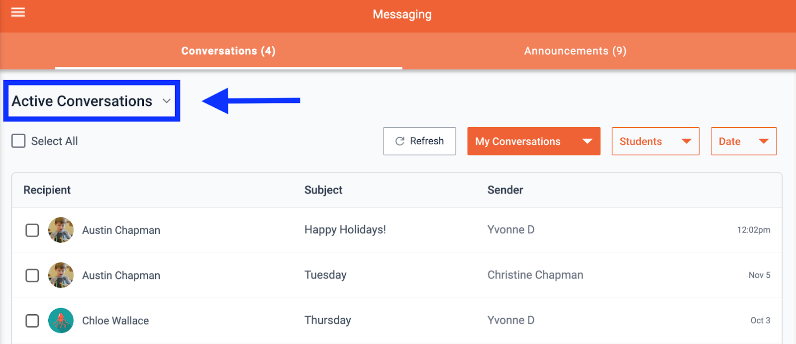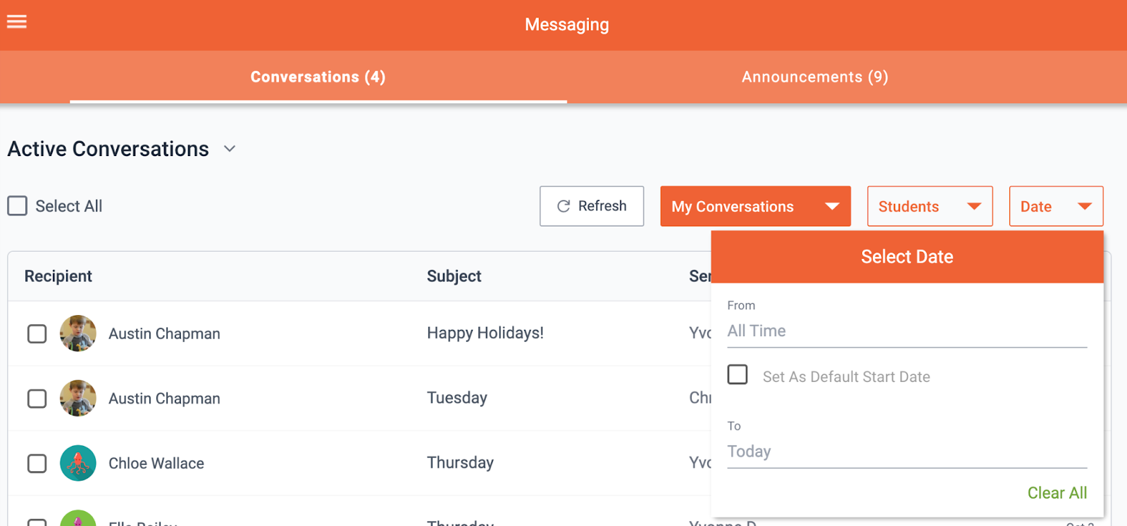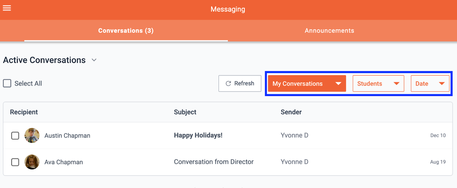 Directors or teachers can utilize the various Conversation filter options to quickly sift through the messages in their Conversations inbox. Messages can be filtered by 'My Conversations' or 'All Conversations', by student(s), or by date range.