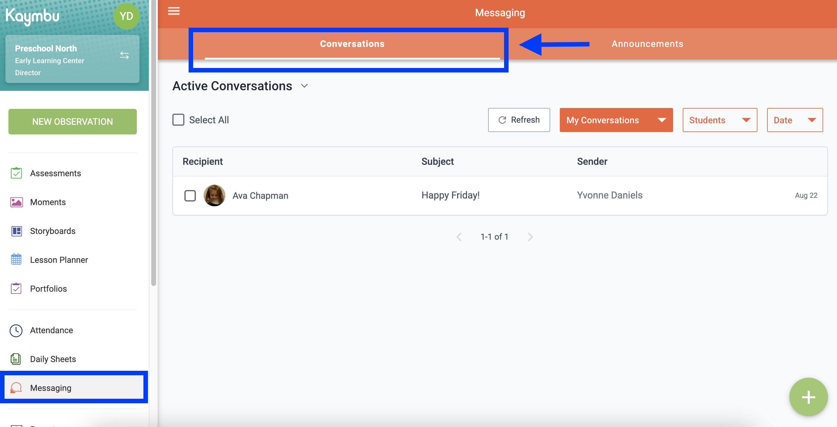 Please note that when a family responds to a Conversation, staff will not receive an email. Directors and teachers can view Conversations directly on Kaymbu's Messaging platform.