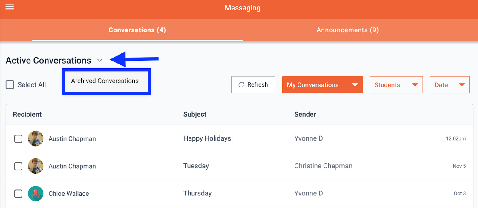 To view your Archived Conversations, click the drop-down arrow next to “Active Conversations” and select “Archived Conversations.”