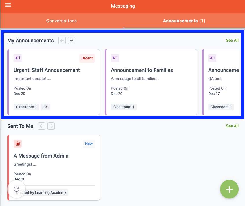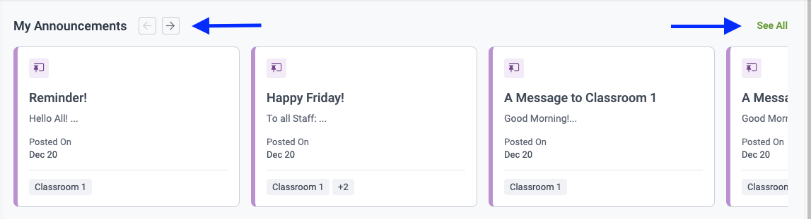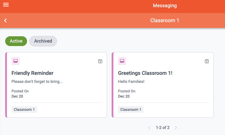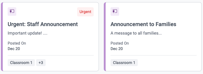Both Active and Archived Announcements can be viewed by clicking into each center or classroom. When viewing classroom Announcements as a high-level user, the Announcement cards are indicated with pink tabs. High-level users are able to archive or restore these Announcements when needed.
