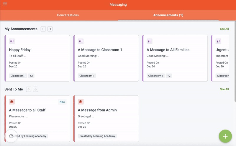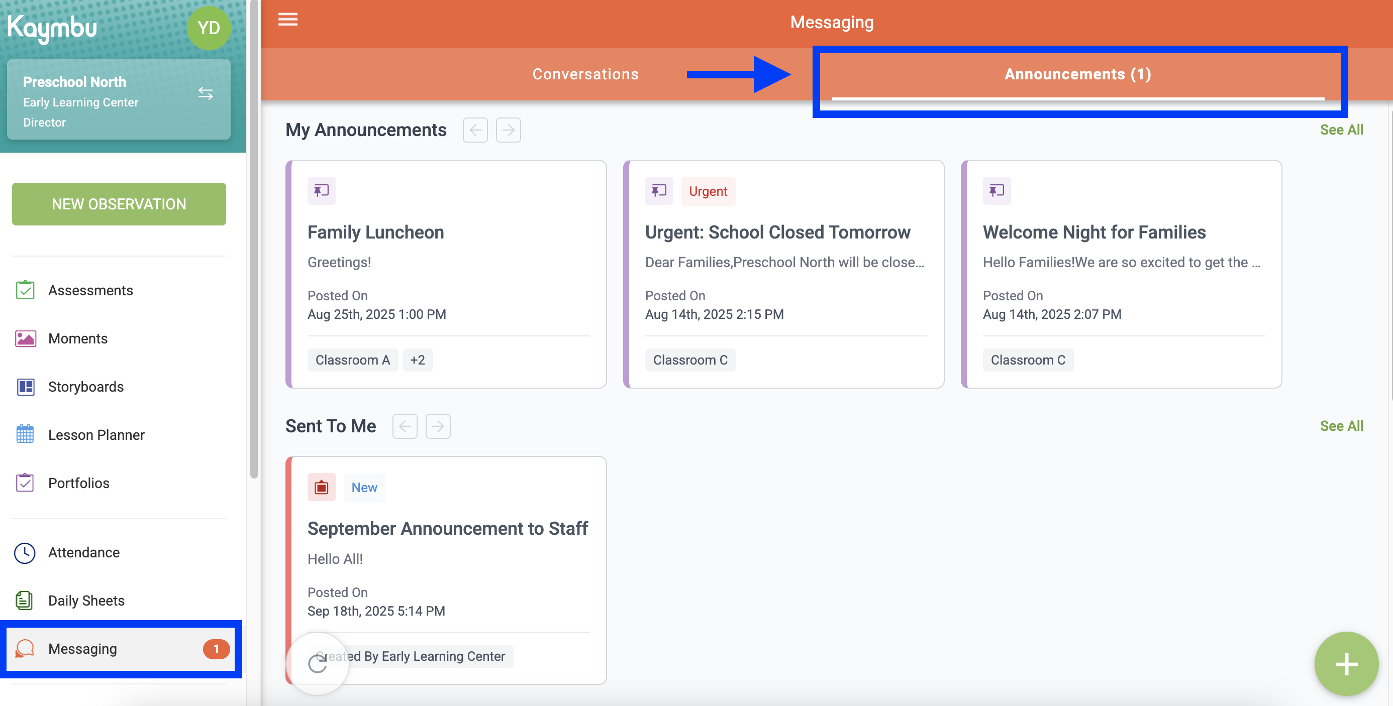 Announcements is a feature on Kaymbu's Messaging platform that allows administrators, directors, and teachers to share general communications or urgent updates to their school community. Designed to function similarly to a bulletin board, Announcements are a way to temporarily post current and important information for staff and families.