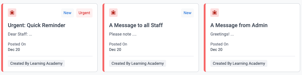 At a glance, each Announcement card includes the subject or title of the Announcement, a preview of the message, and its post date. The top of the card will indicate if the Announcement was sent as Urgent, while the bottom of the card will indicate the recipient(s).