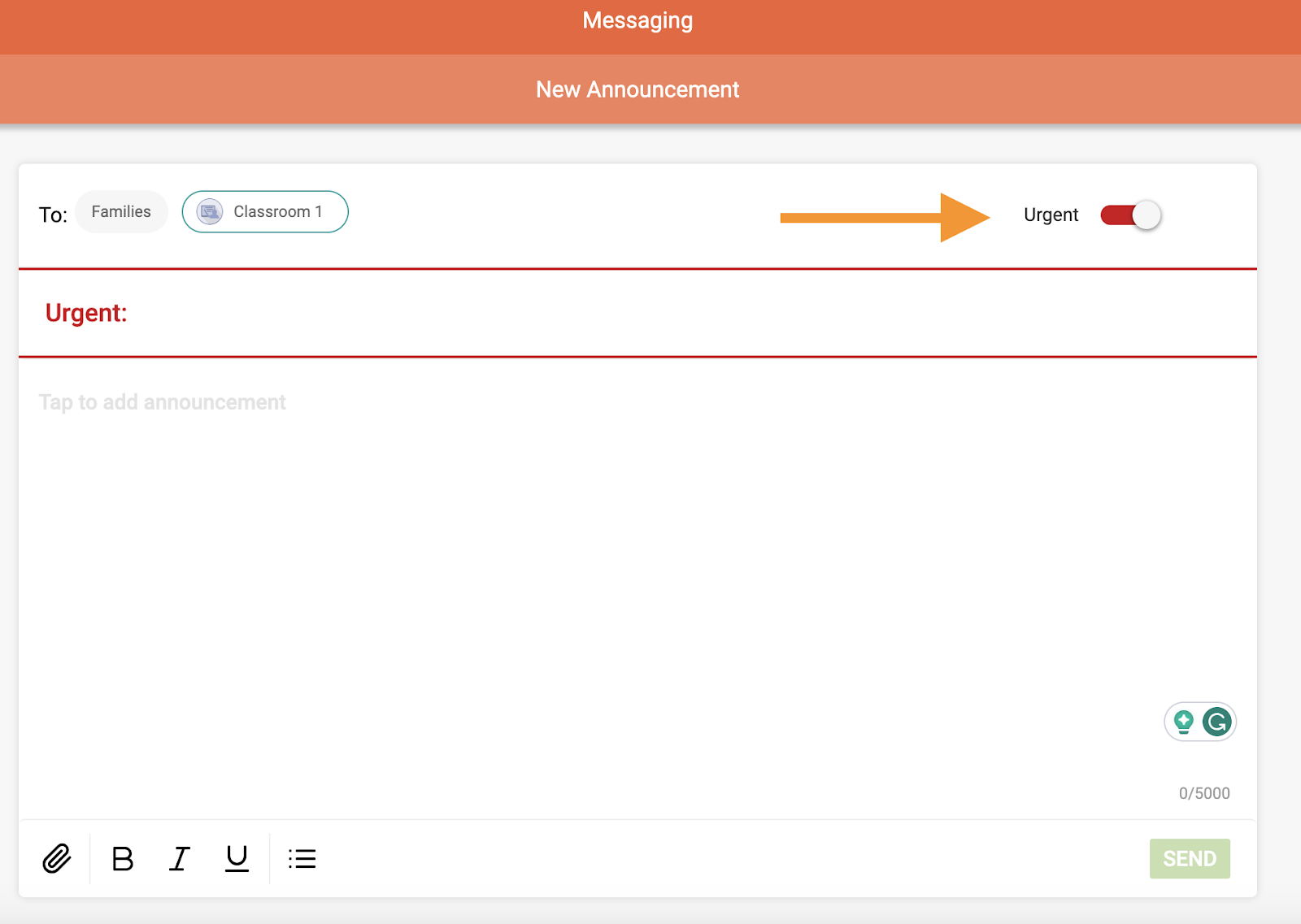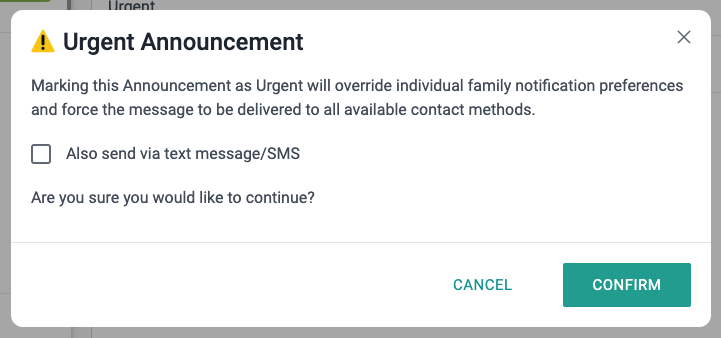 To send an Announcement as urgent, simply toggle the “Urgent” option ON when drafting the message. Upon doing so, a prompt will appear informing you that an urgent message will notify recipients through all contact methods. However, you do have the option of whether or not to include an SMS notification.