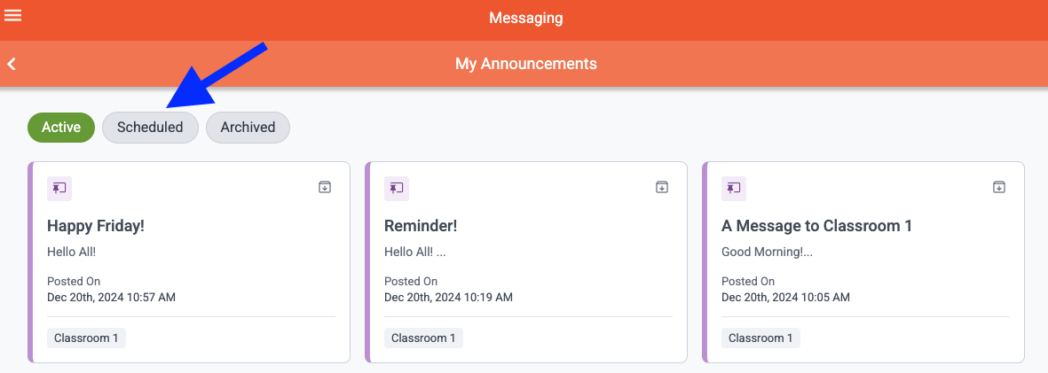 Once on the My Announcements grid page, select “Scheduled” to view all of your scheduled Announcements. Then, click on the message card you would like to edit.