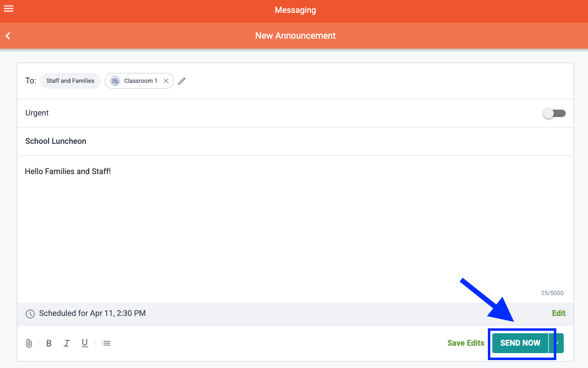 Scheduled Announcements will be automatically sent on the date and time selected for that particular message. However, users will always have the option to send any scheduled Announcements immediately if desired. If you wish to send a scheduled Announcement in real-time, simply select “Send Now” at the bottom of the page to send the Announcement to recipients.