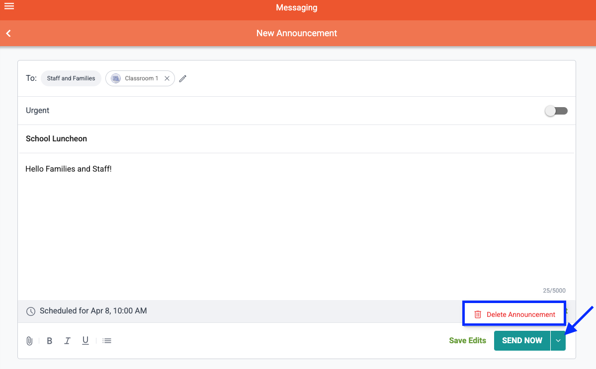 Similar to creating a regular Announcement, when drafting a scheduled Announcement, you have the option to select families and/or staff as recipients. Additionally, you can mark a scheduled Announcement as Urgent if needed. To create a scheduled Announcement, follow the steps below: