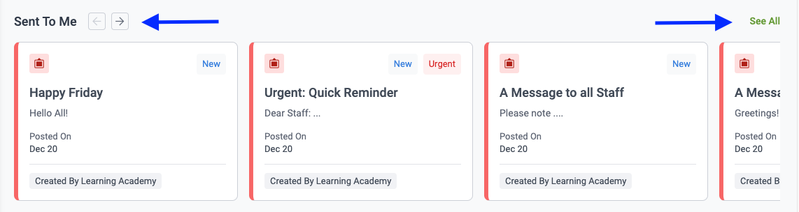 You can scroll through your row of Announcement cards by clicking on the navigation arrows, or you can choose to view all of the Announcements you have received by selecting “See All,” which will take you to the “Sent To Me” grid page.