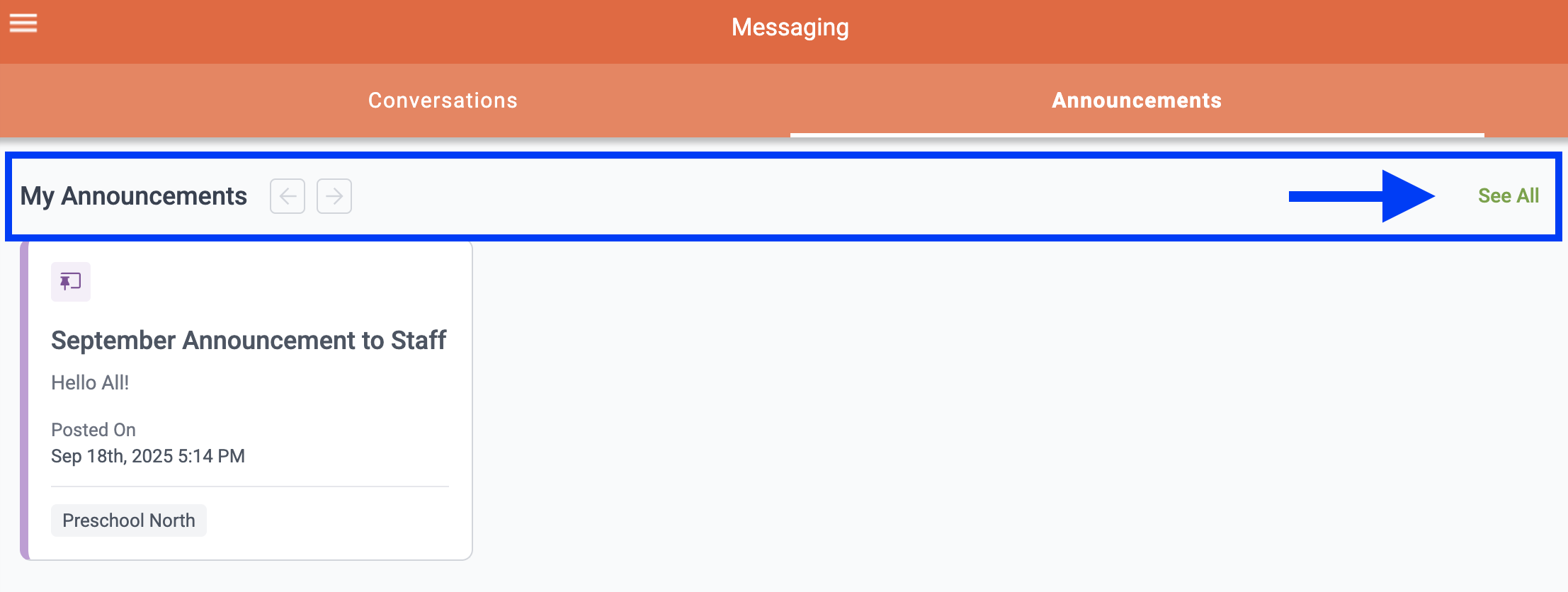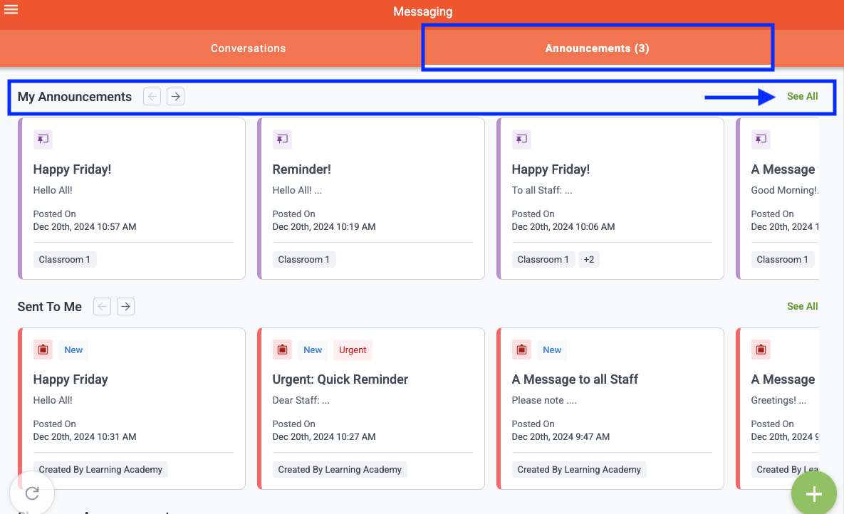 Kaymbu users can access Announcements by navigating to Menu > Messaging and selecting the "Announcements" tab at the top of the page. All Announcements sent and received through Kaymbu’s Messaging platform will be stored within the "Announcements" tab on the Messaging page.