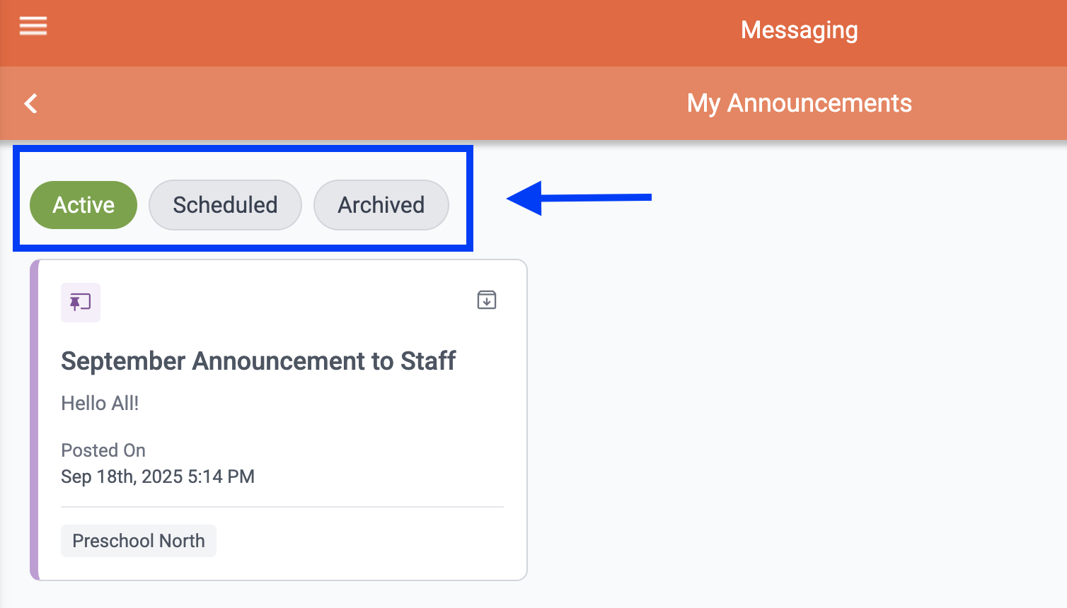 To archive an Announcement, navigate to the "Announcements" tab on the Messaging page. Click on the Announcement card to open the message, and then click the archive icon at the top of the page.