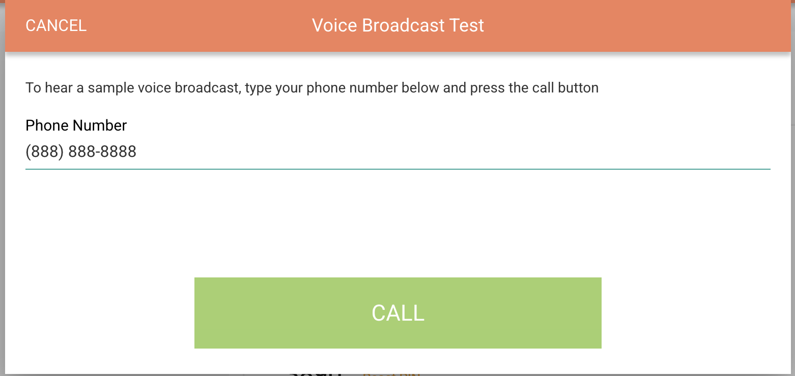 From the Voice Broadcast page, you can send a test broadcast to your phone by selecting "Send Test" at the bottom of the page. In doing so, you will be prompted to enter your phone number, and an automated test broadcast will be sent to your phone.