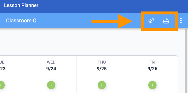 To print your lessons or materials list, simply click on the printer icon located in the top right corner of the page. To share your lessons with your families, select the paper airplane icon. You'll be able to share your daily lessons, a weekly summary, and even your supply list for the week!