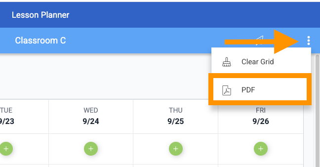 In addition to printing and sharing copies of your lesson plans, you can also choose to download a PDF version of your lessons. To do so, click on the three dots at the top right corner of the page and select “PDF”.