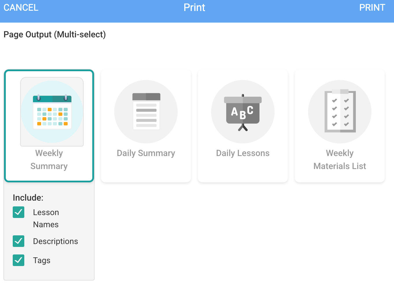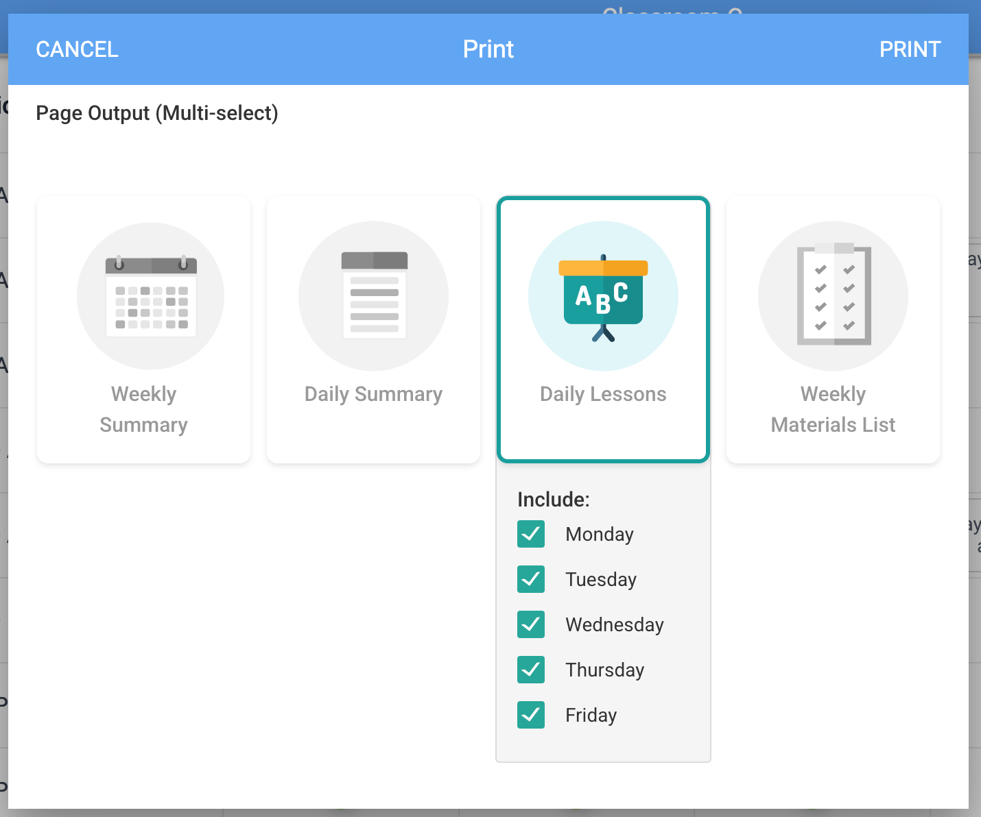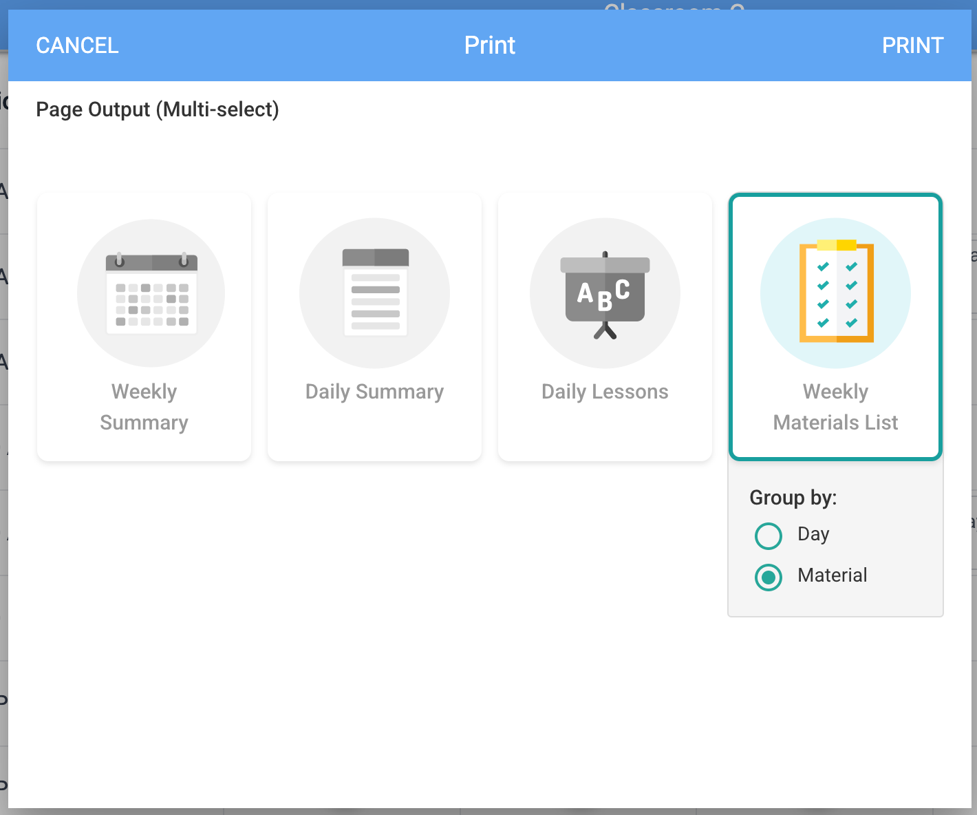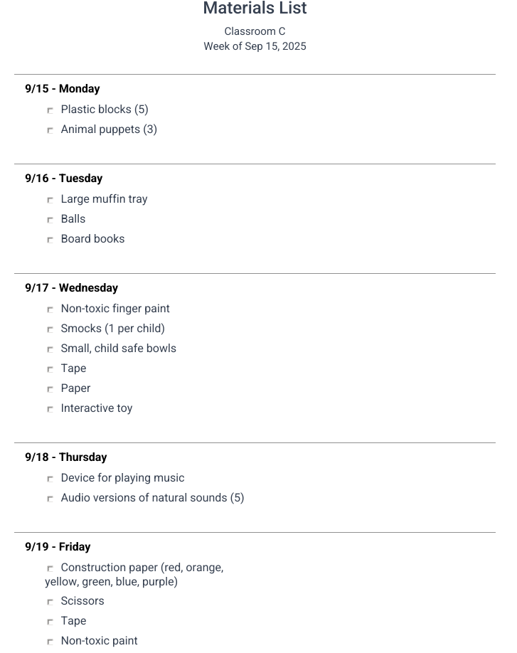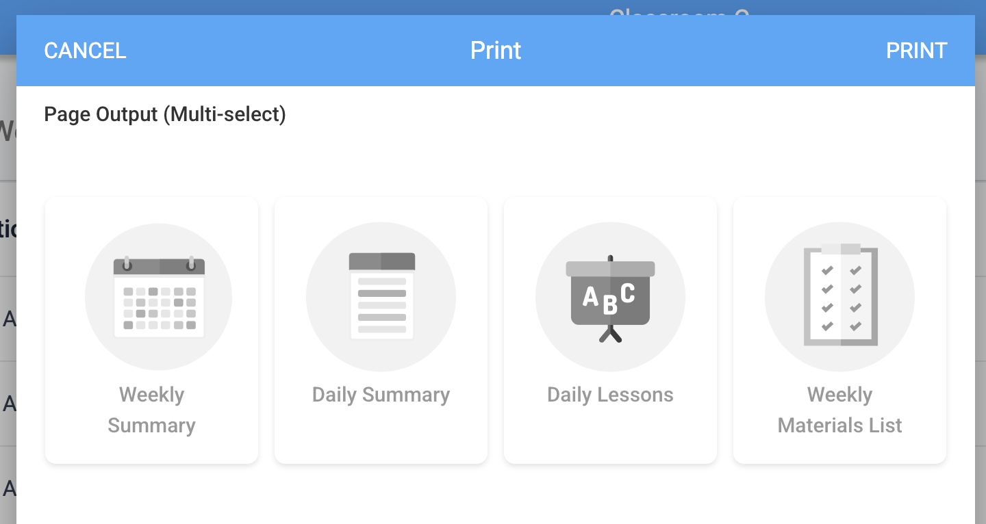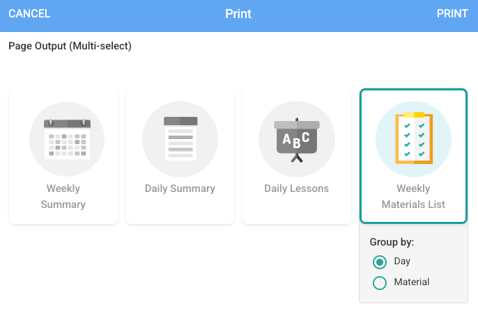 Prepare for your day and week with customizable print views. Print and share weekly and daily summaries, full lessons, or even generate a supply list based on all the materials in your lesson plans for the day or week.