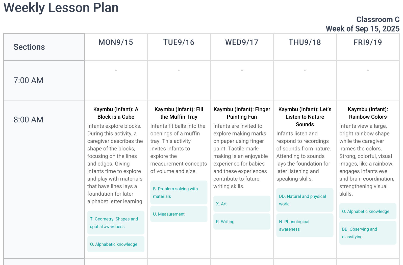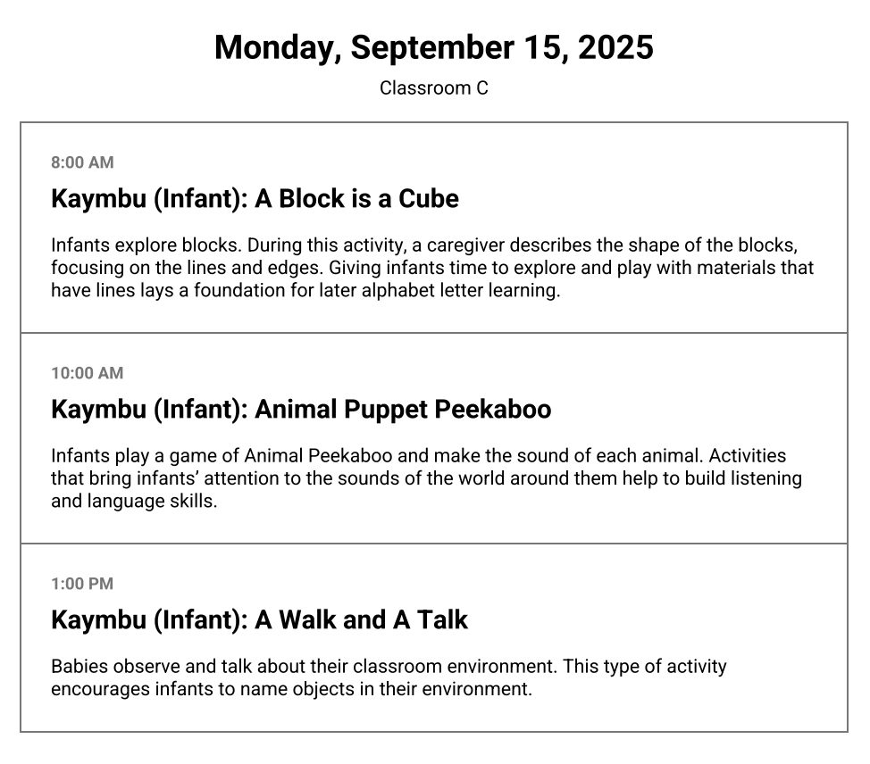 The Daily Summary layout populates all lessons for each day of the week or for a selected day. An overview of the lesson, which includes the lesson title and description, will be listed for each selected day(s).