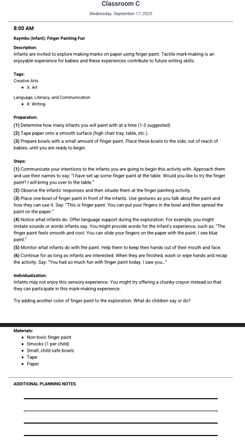 An “Additional Planning Notes” section is also included after each lesson to accommodate any manual notes that may need to be added when printing Daily Lessons.