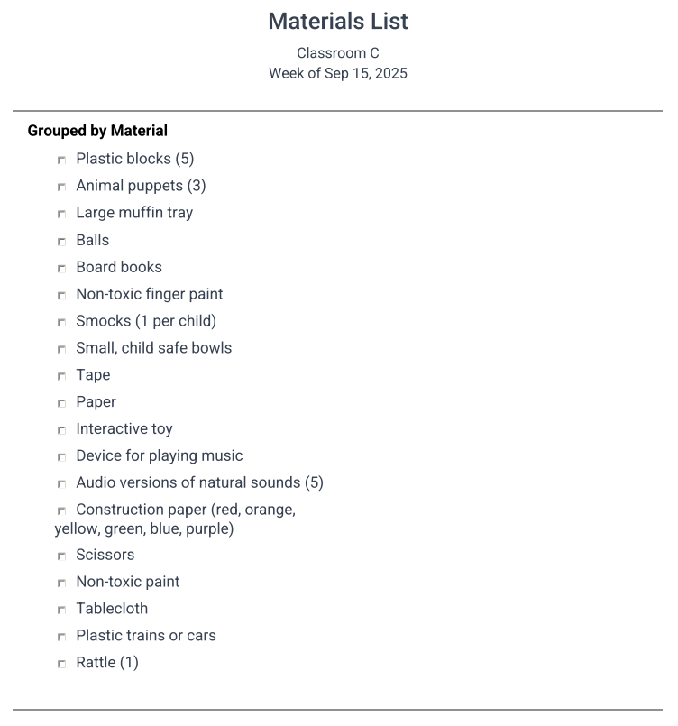 The Weekly Materials List populates a list of all lesson materials needed throughout the week. You can choose to group the materials by day or by material.